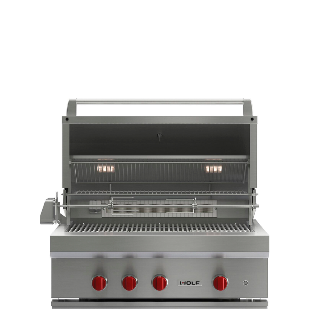 для равномерного распределения тепловой энергии. Электрический вертел с инфракрасным элементом позволяет готовить сочную птицу или жаркое. Газовый гриль Wolf может быть встроенным или перемещаться на специальной тележке. Функционирует на природном газе или газе пропане.