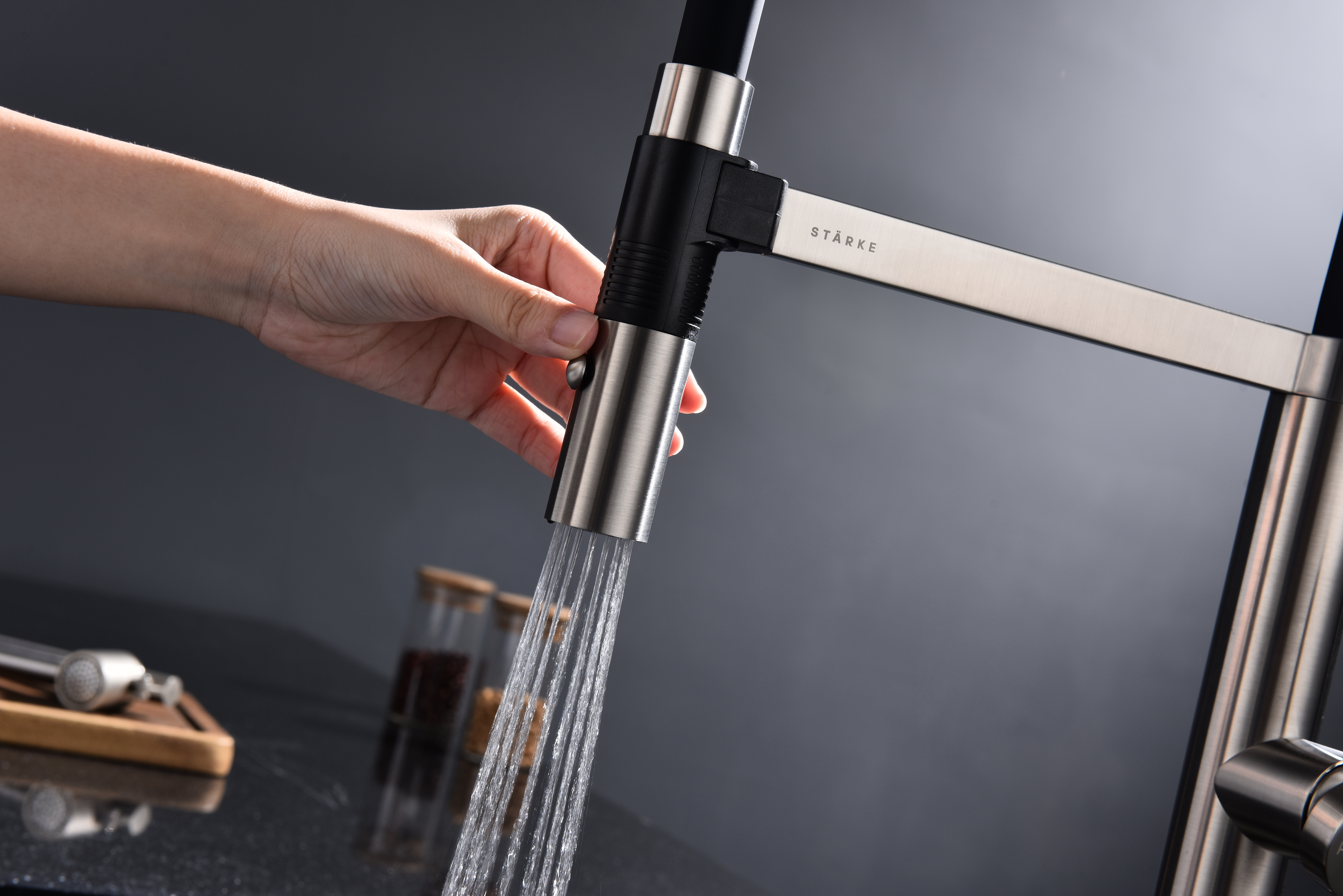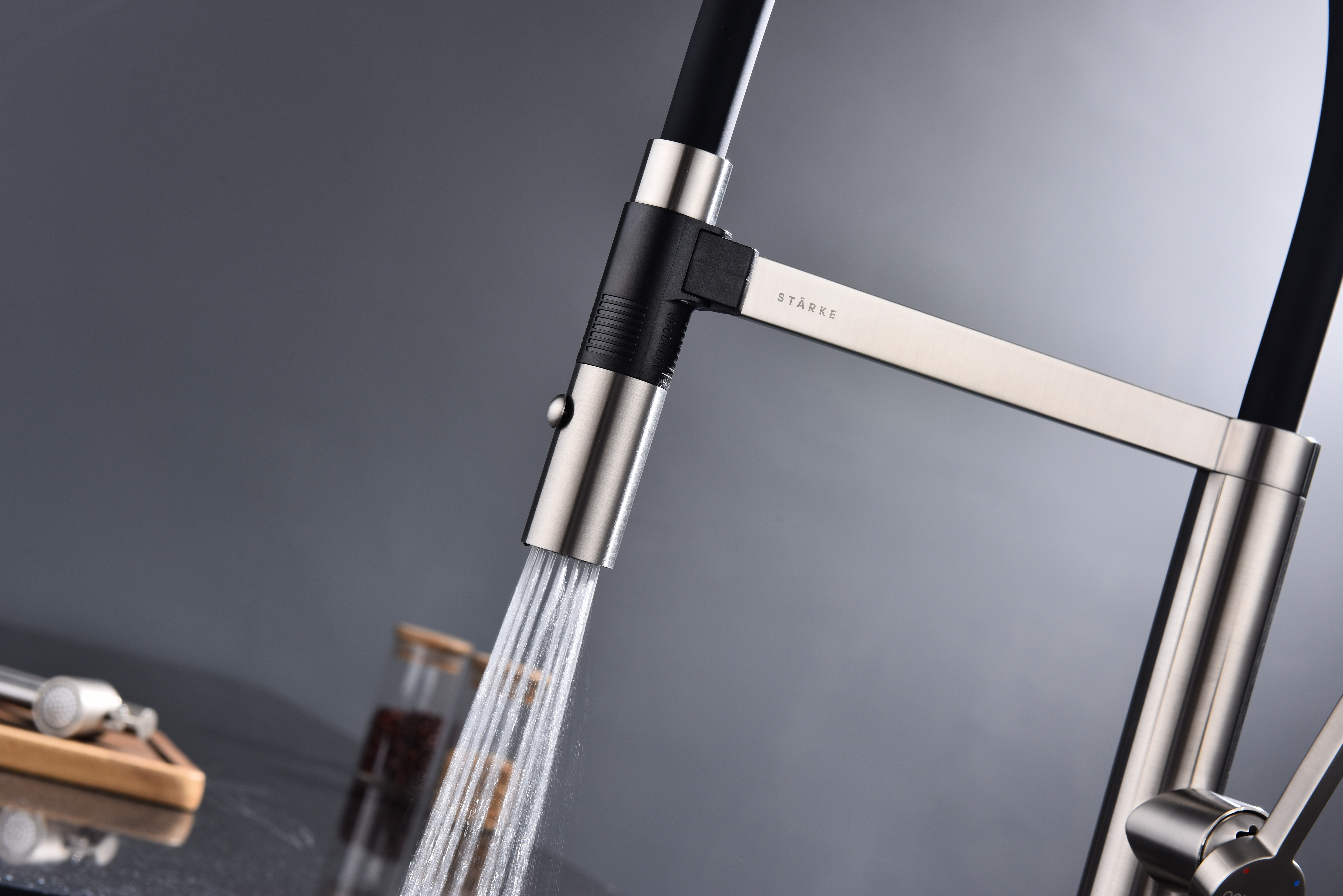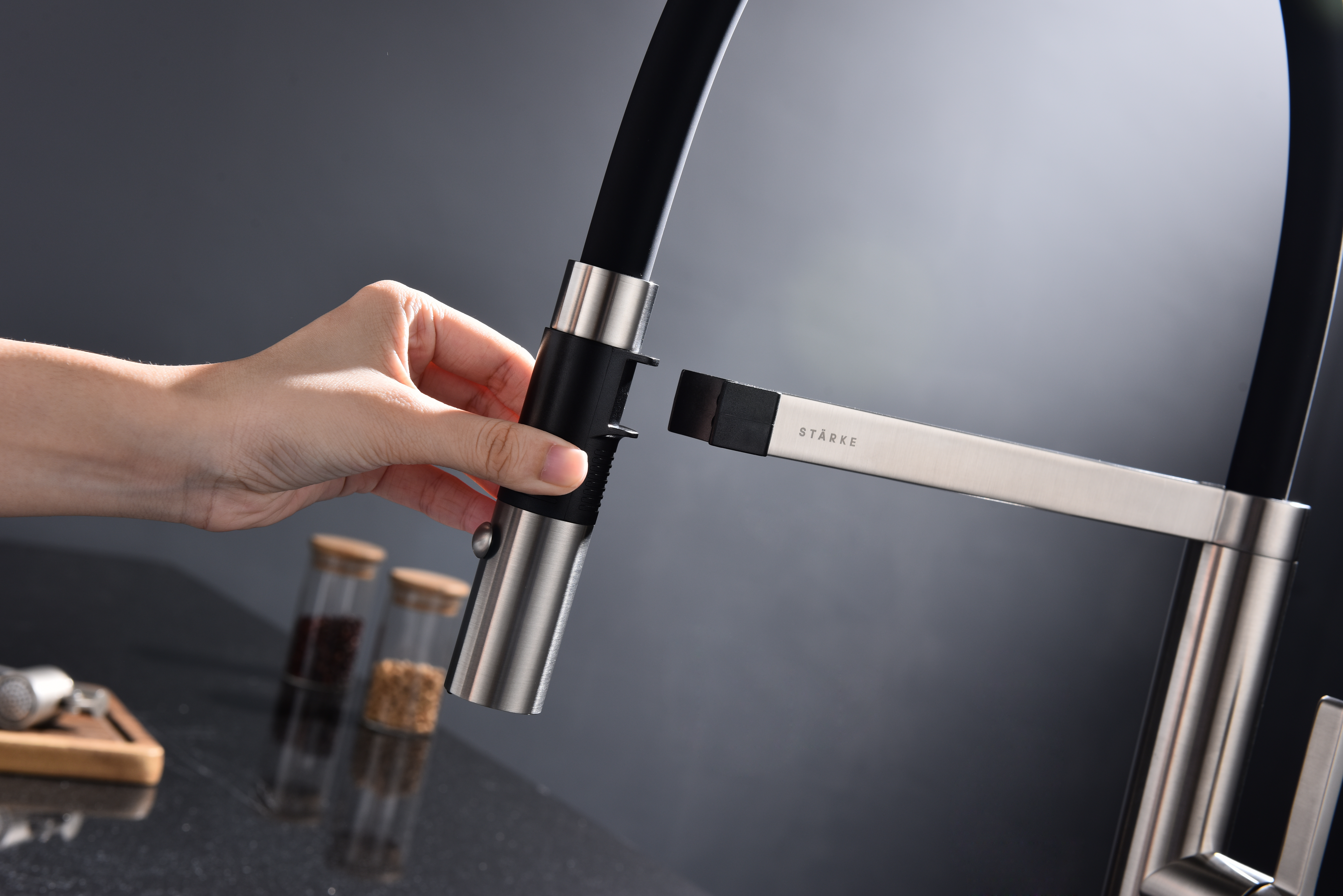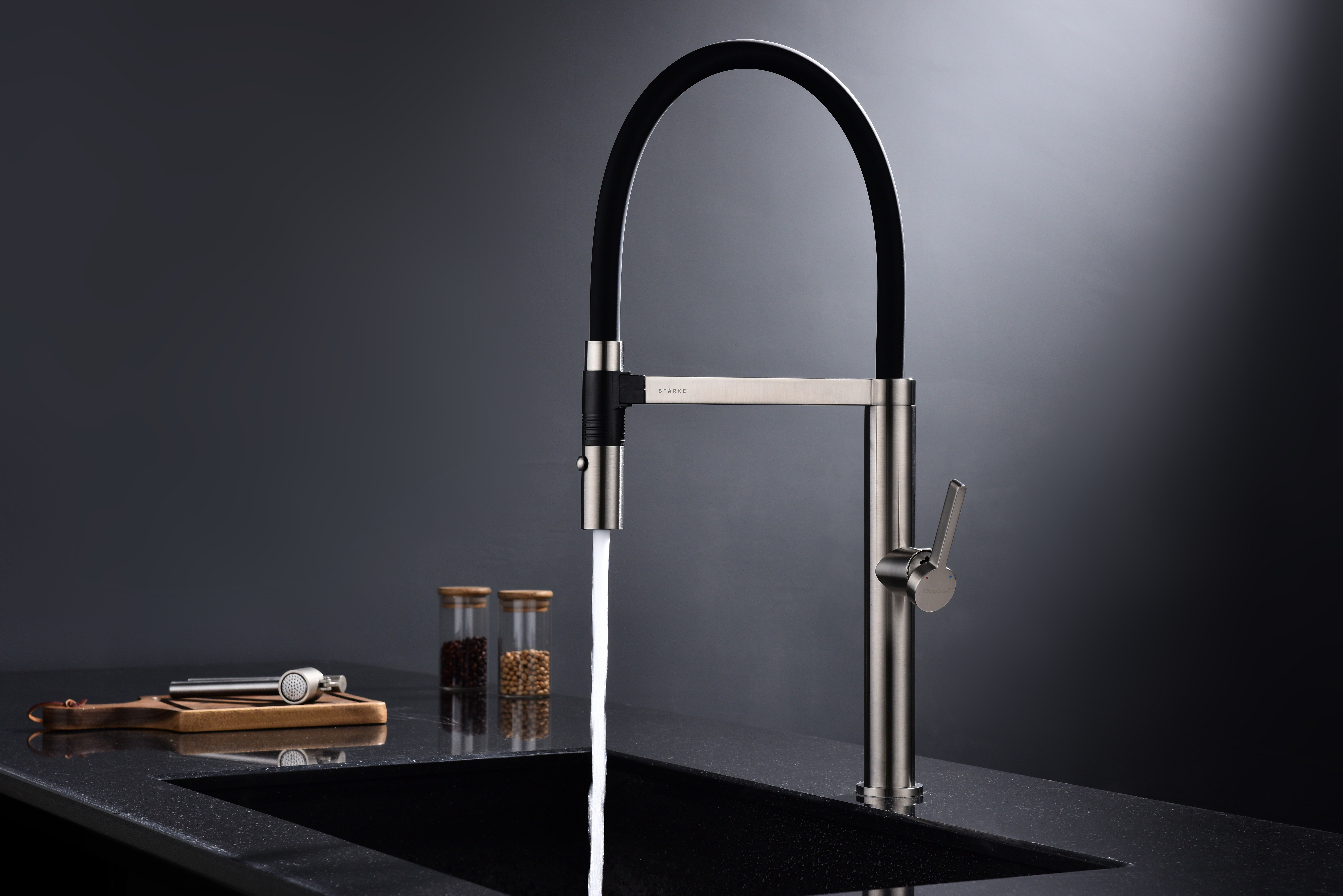 Излив смесителя выполнен из высокопрочного силикона. Конструкцией предусмотрен магнитный механизм фиксации излива.