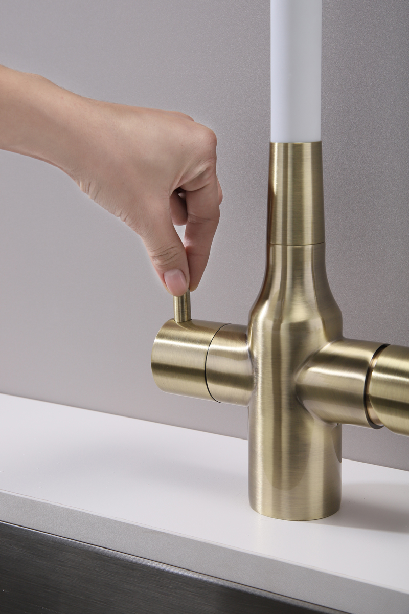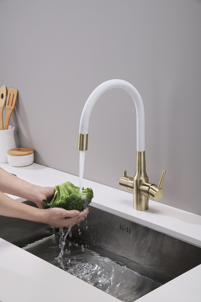 Смеситель для кухни SALIX c возможностью подключения системы фильтрации питьевой воды изготовлен из высококачественной латуни, которая отвечает высочайшим европейским стандартам качества, не содержит свинца, не разрушается со временем и безопасна для здоровья.