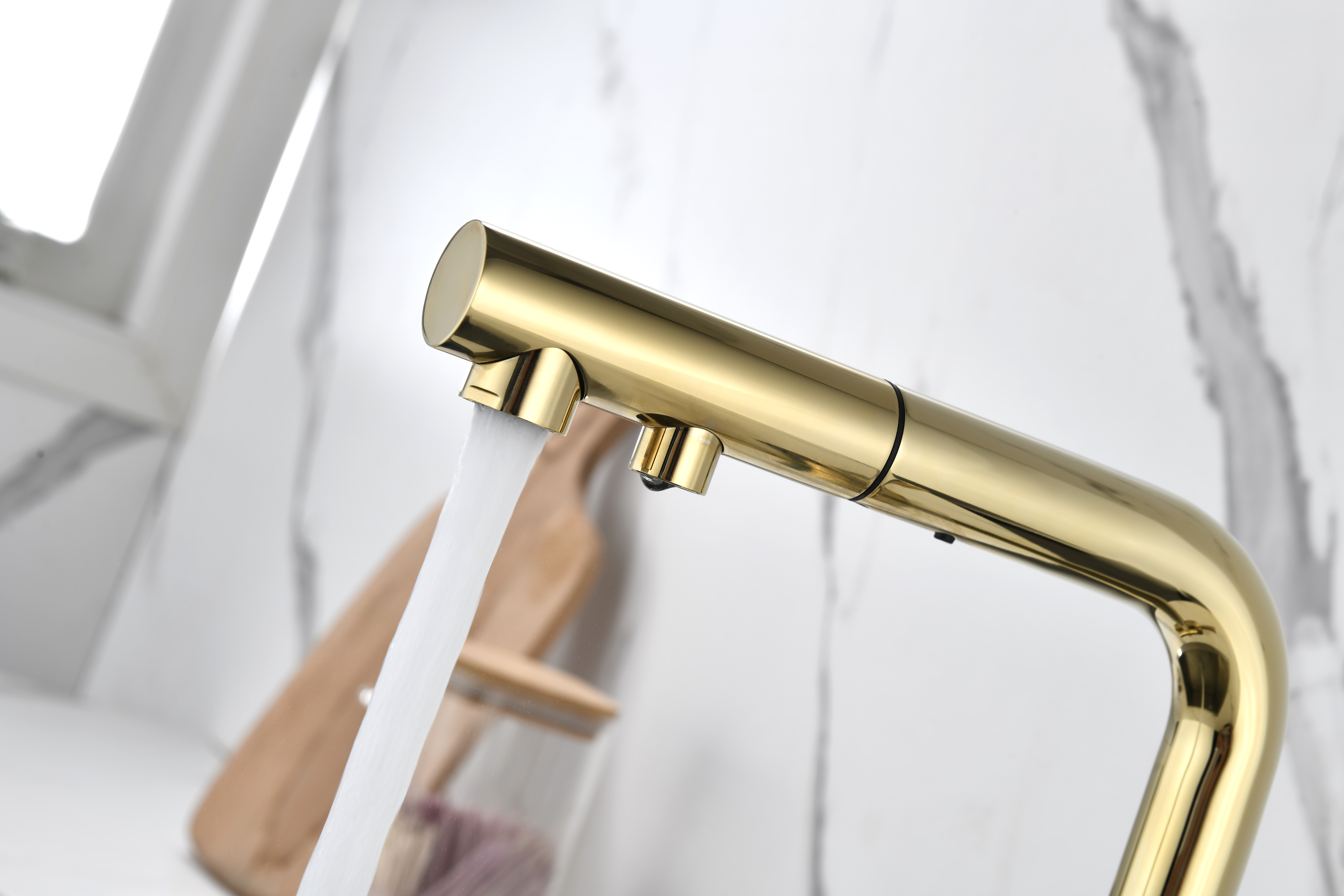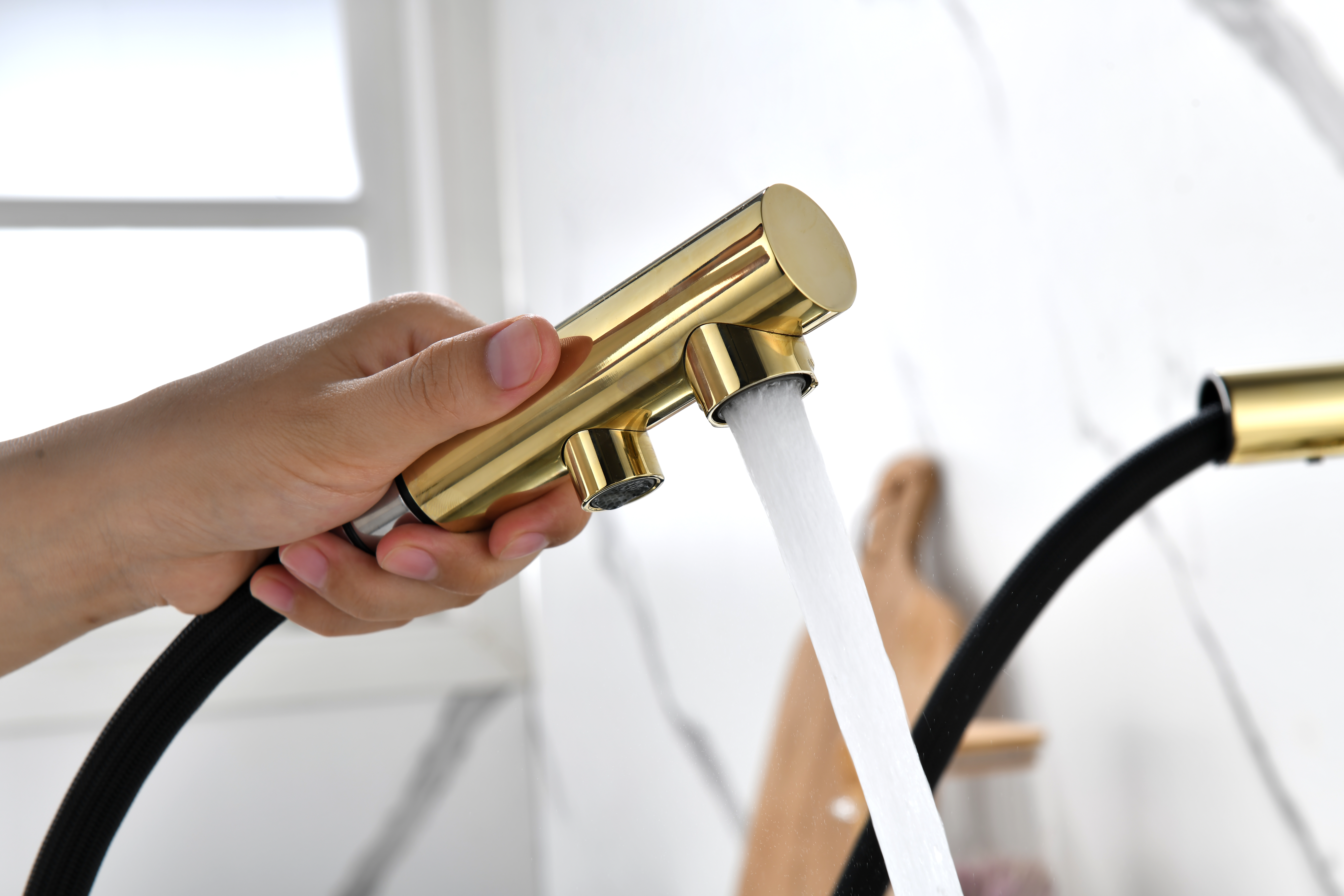 Смеситель оснащен гибким выдвижным изливом из нейлоновой оплетки, которая обладает отличной устойчивостью к истиранию и разрушению. Данная техническая особенность расширяет рабочую зону смесителя, позволяя пользоваться им с удобством в больших мойках, мойках с двумя чашами, или наполнять водой ёмкость на столе рядом с мойкой, в том числе питьевой водой.