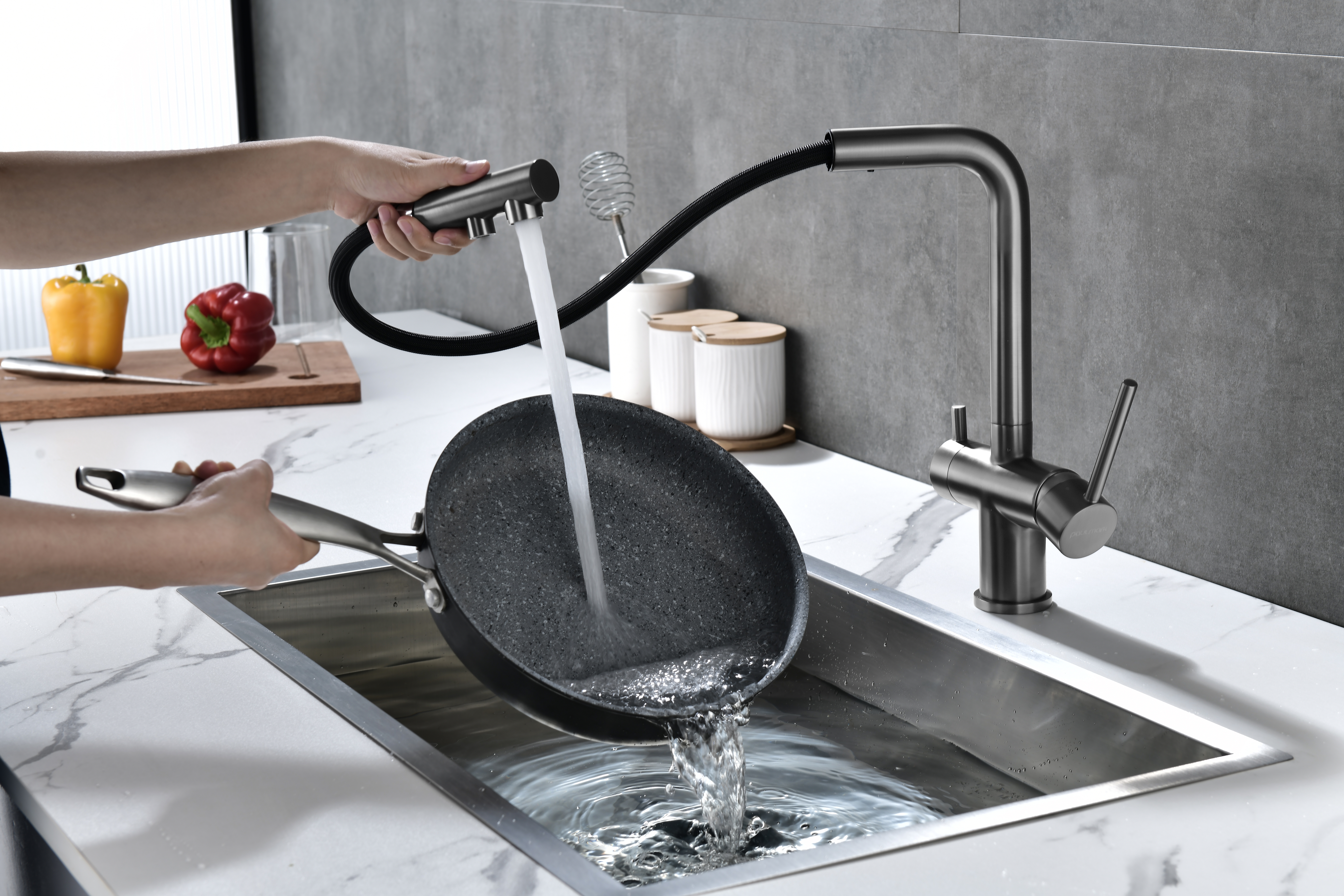 Смеситель оснащен гибким выдвижным изливом из нейлоновой оплетки, которая обладает отличной устойчивостью к истиранию и разрушению. Данная техническая особенность расширяет рабочую зону смесителя, позволяя пользоваться им с удобством в больших мойках, мойках с двумя чашами, или наполнять водой ёмкость на столе рядом с мойкой, в том числе питьевой водой.